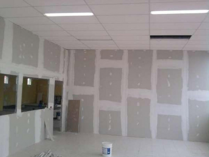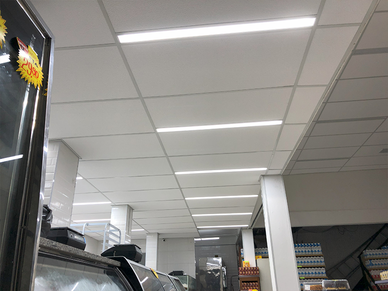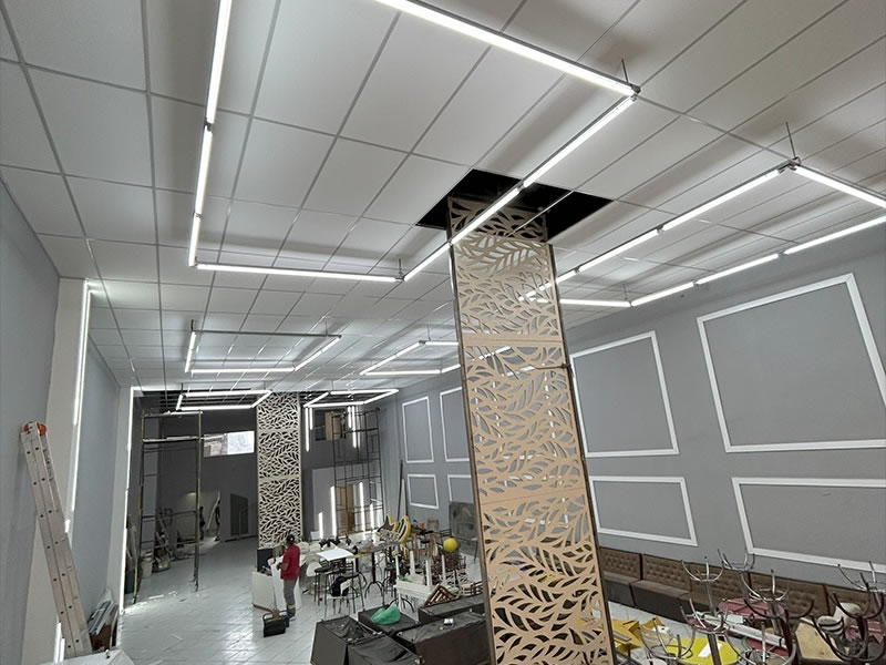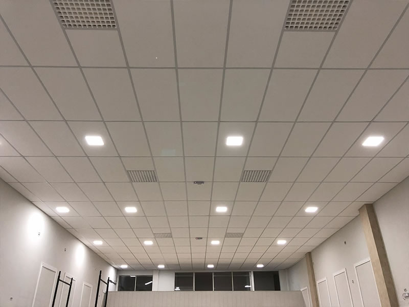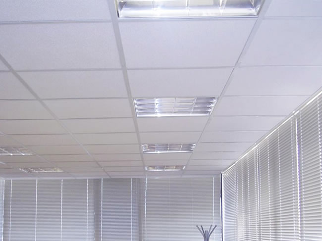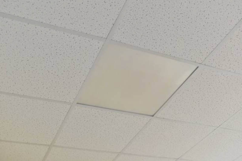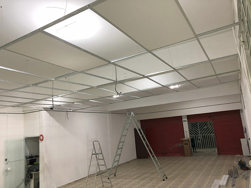 A instalação é rápida e limpa. É montada uma estrutura metálica em “T” suspensa por tirantes, onde as placas são apenas apoiadas. Isso facilita muito a manutenção de fiações e tubulações acima do forro.